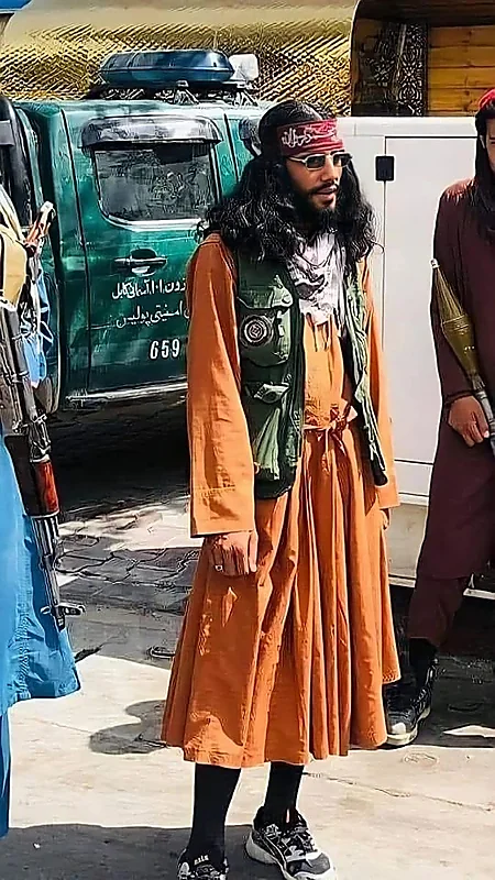 وظهر في الصورة عضو من طالبان وهو يرتدي فستان قصير باللون البرتقالي من بيت الأزياء العالمي "جوتشي" والذي يبلغ سعر الفستان 3,500 ألف دولار، كما ارتدى حذاء رياضي من asix shoes يبلغ سعره 90 دولار، وفيست سعره 930 دولار، ونضارة من ماركة ريبان سعرها 161 دولار.