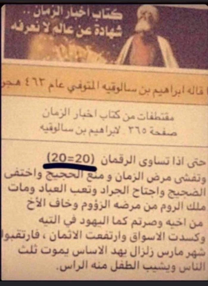 وتضمنت القصاصة الورقية المتداولة، أن مؤلف الكتاب إبراهيم بن سالوقيه المتوفى عام 463 هجرية تنبأ بأحداث كورونا، إذ جاء في نصها: "حتى إذا تساوى الرقمان (20=20)، وتفشى مرض الزمان، منع الحجيج، واختفى الضجيج، واجتاح الجراد، وتعب العباد، ومات ملك الروم، من مرضه الزؤوم، وخاف الأخ من أخيه، وكسدت الأسواق، وارتفعت الأثمان، فارتقبوا شهر مارس، زلزال يهد الأساس، يموت ثلث الناس، ويشيب الطفل منه الرأس".