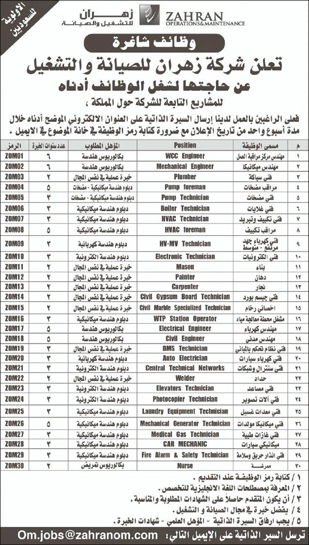 طرحت شركة زهران للصيانة والتشغيل 30 وظيفة حرفية وفنية وهندسية شاغرة للرجال بـ"عقود حكومية " لحملة البكالويوس والدبلوم وما أقل .