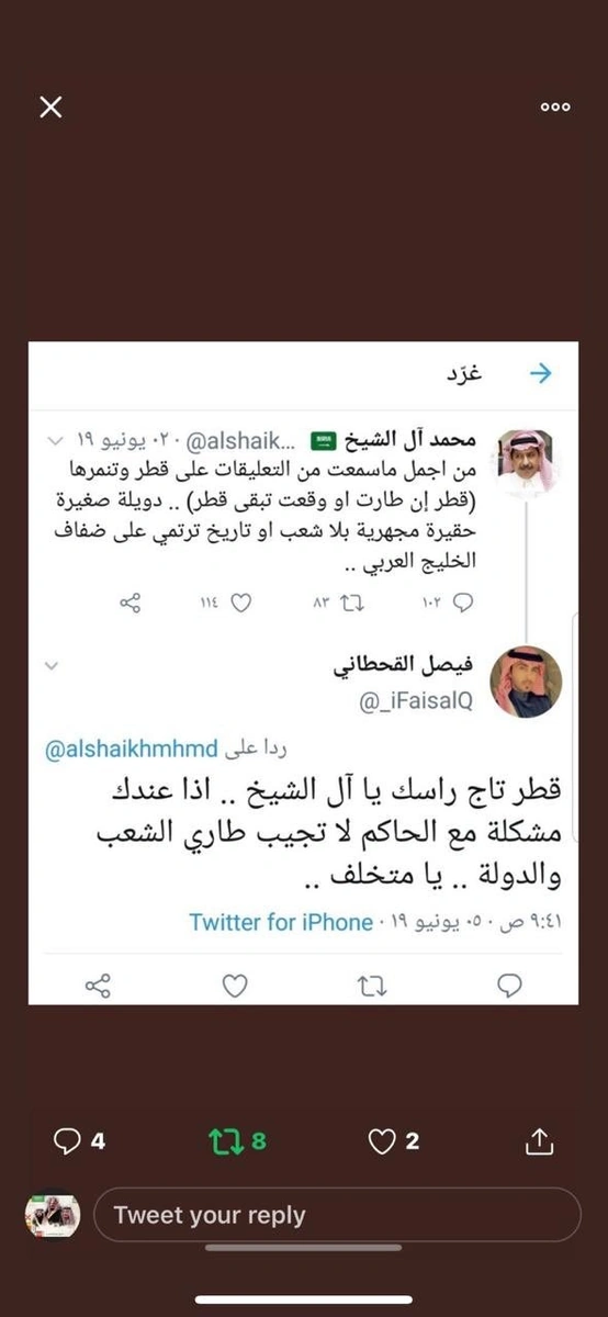 ونشر محمد آل الشيخ، الدليل على حديثه وهو تغريدة له قال فيها " قطر تاج راسك يا آل الشيخ، إذا عندك مشكلة مع الحاكم لا تجيب طاري الشعب والدولة " .