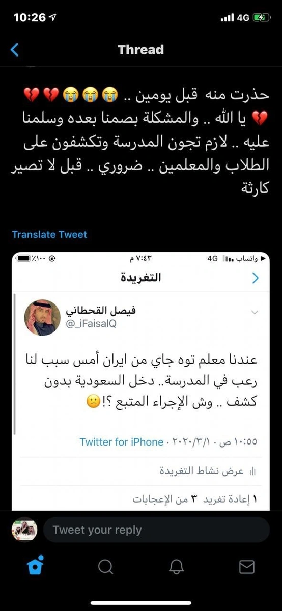 شاهد.. هوية تغريدة المعلم القادم من إيران " قطري أراد إفزاع المواطنين "