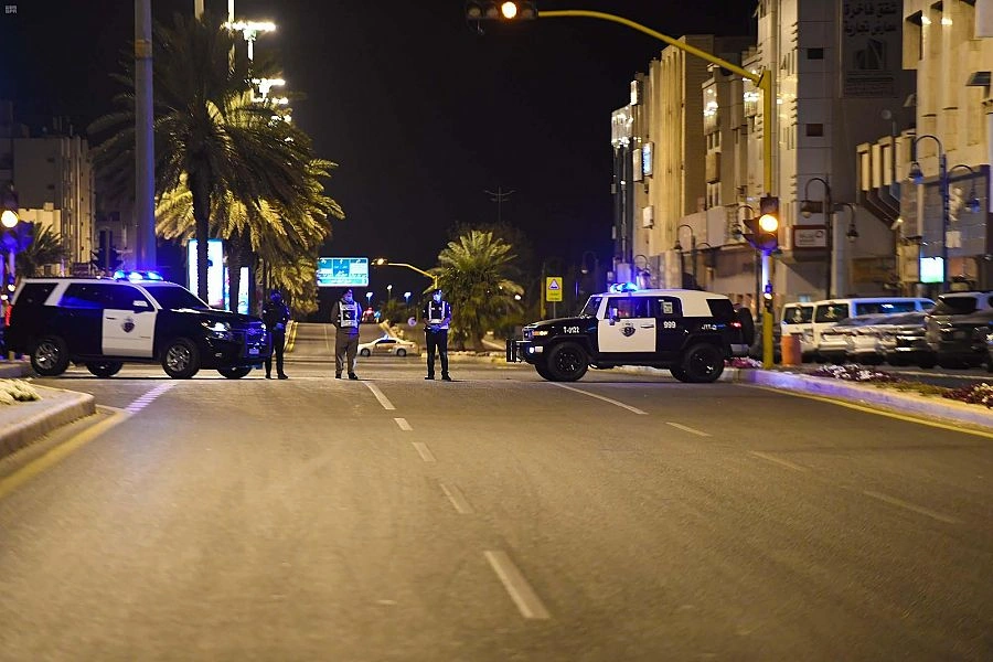 رجال الأمن يؤدون صلاة المغرب أثناء متابعتهم منع التجول بتبوك (صور)