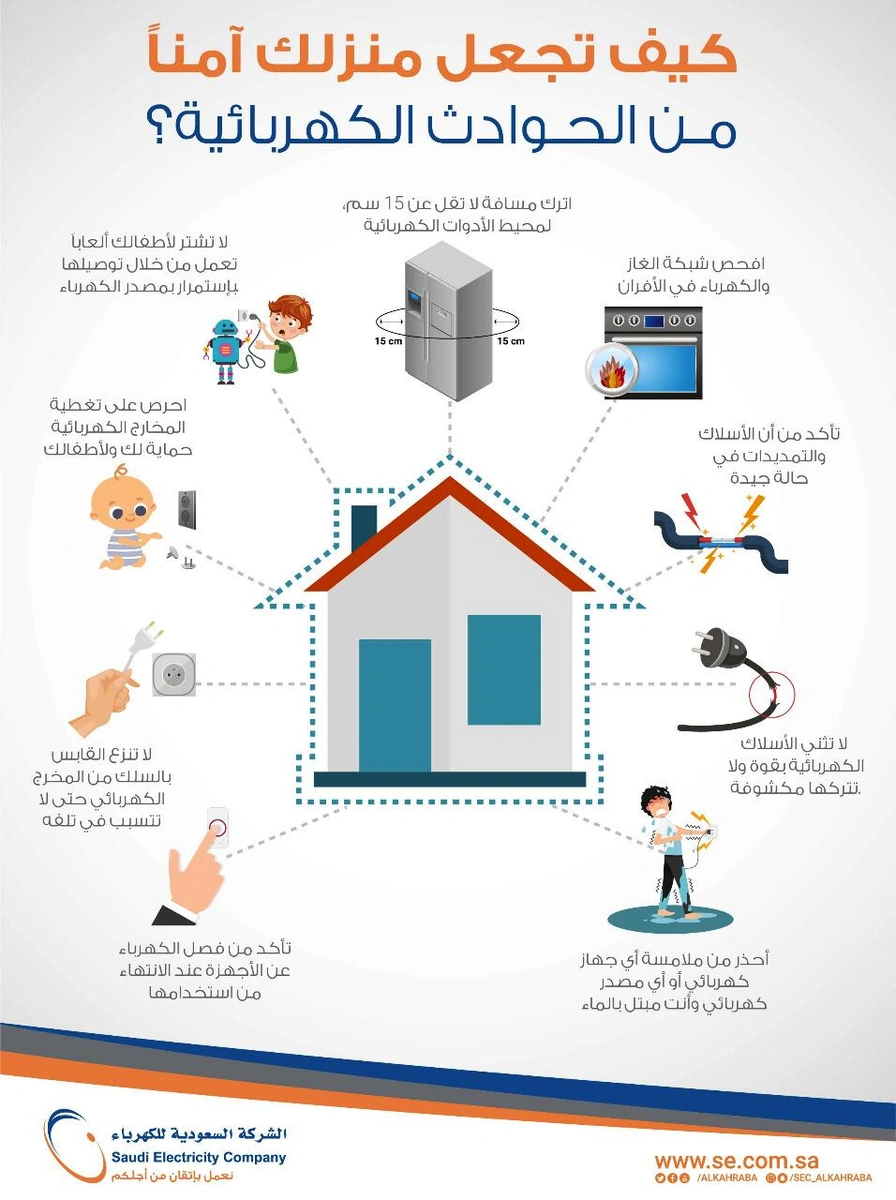 دعت الشركة السعودية للكهرباء، المشتركين إلى ضرورة اتخاذ الإجراءات الاحترازية الكفيلة بتوفير سلامتهم من الحوادث الكهربائية في منازلهم. ونبهت إلى الحرص على عدم الاستخدام الخاطئ للأجهزة الكهربائية، وإلى التأكد بين حين والآخر من أن الأسلاك والتمديدات في المنزل في حالة جيدة، وعدم ثنيها بقوة، والتأكد أيضاً من فصل التيار عن الأسلاك المكشوفة، وتغطية المخارج الكهربائية للحماية.