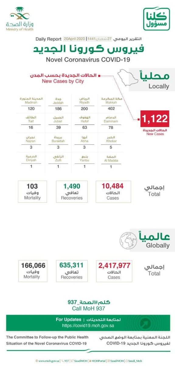 وأوضح الدكتور محمد العبدالعالي، خلال المؤتمر الصحفي اليومي لفيروس كورونا، أن إجمالي الحالات ارتفع ليصل إلى 10.484 حالة إصابة؛ فضلًا عن تسجيل 6 حالات وفيات.