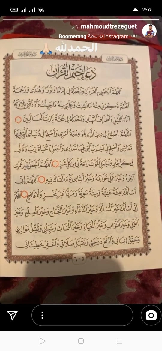 ونشر " تريزيجيه " صورة على حسابه الرسمي بـ "انستجرام " تتضمن دعاء ختم القرآن الكريم معلقاً عليها بـ " الحمد لله " لتنهال عليه الدعوات الطيبة والتعليقات المباركة بالشهر الكريم .
