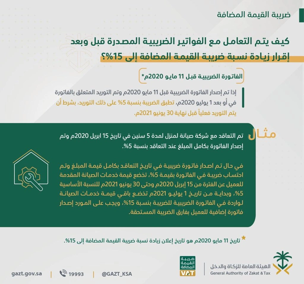 كشفت الهيئة العامة للزكاة والدخل، اليوم الأربعاء، عن أمثلة بخصوص آلية التعامل مع الفواتير الضريبية المصدرة قبل وبعد إقرار زيادة نسبة ضريبة القيمة المضافة إلى 15%، في حال تم إصدار الفاتورة الضريبية قبل 11 مايو 2020.