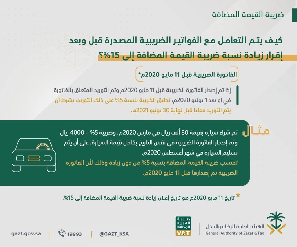 وضربت الهيئة مثالا على ذلك: " تم شراء سيارة بقيمة 80 ألف ريال في مارس 2020، وضريبة 5% =4 آلاف ريال، وتم إصدار الفاتورة في نفس التاريخ بكامل قيمة السيارة، على أن يتم التسليم في أغسطس 2020، تحتسب ضريبة القيمة المضافة بـ 5% دون زيادة، لأن الفاتورة الضريبية تم إصدارها قبل 11 مايو " .