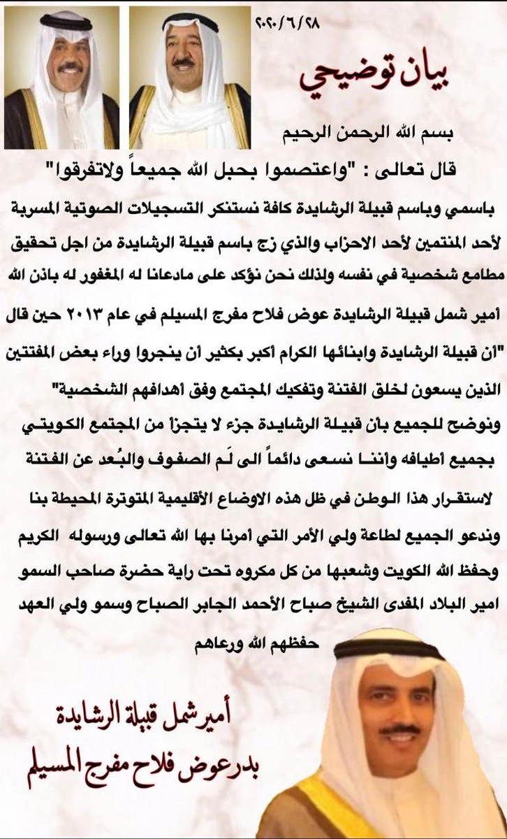 استنكر بدر عوض المسيلم أمير شمل قبيلة الرشايدة في الكويت، التسجيلات المسربة التي تم خلالها الزج باسم قبيلته.
