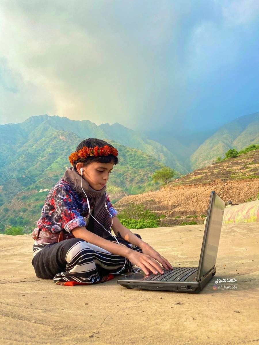 صورة تخطف الأنظار لطالب بالزي الجبلي أثناء الدراسة عن بعد بجازان