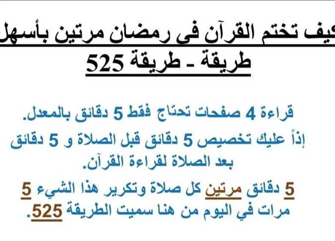 ويبحث الملايين من المسلمين في مشارق الارض ومغاربها على أبسط وأسهل الطرق التي تساعد في ختم القرآن الكريم في رمضان أكثر من مرة، حيث تعتبر الأفضل هي طريقة «525»، والتى تساعد على ختم القرآن مرتين خلال شهر رمضان.