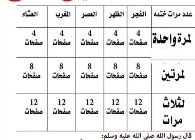 ويمكن ختم القرآن الكريم مرة واحدة فقط خلال شهر رمضان عن طريق قراءة 4 صفحات فقط من المصحف بعد كل صلاة، كما يمكن ختم القرآن مرتين بقراءة 4 صفحات قبل كل صلاة و4 صفحات بعد الصلاة.