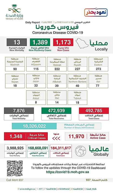 أعلنت وزارة الصحة، اليوم الأحد، عن تسجيل 1173 حالة إصابة جديدة بفيروس كورونا المستجد توزعت في مختلف مناطق المملكة.