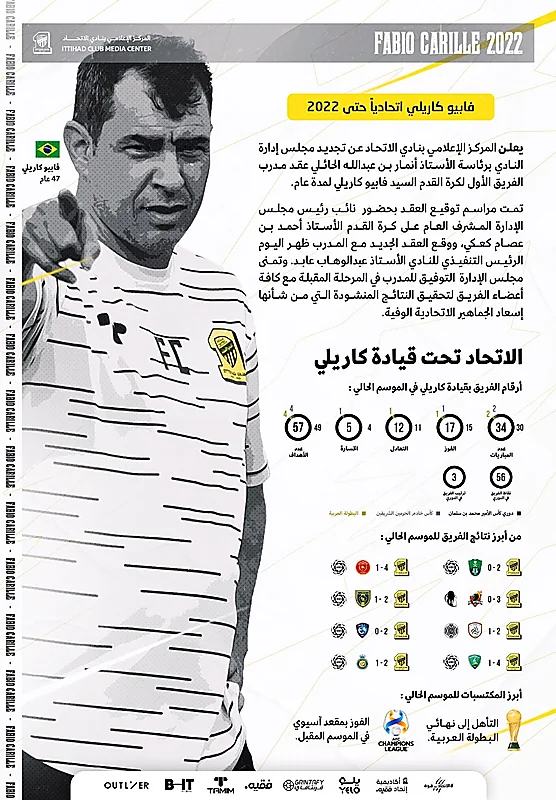 أعلن نادي الاتحاد عن تجدید عقد مدرب الفريق فابيو كاريلي لمدة عام، وذلك برئاسة أنمار بن عبدالله الحائلي.