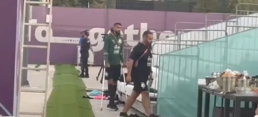 وظهر "الفرج" وهو يسير بعكاز، فيما كان زملائه يواصلون تدريباتهم استعدادا للمواجهة المقبلة أمام بولندا، ضمن منافسات كأس العالم في قطر.