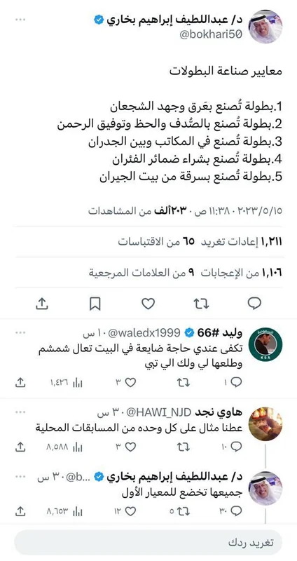 كتب بخاري في تغريدته "معايير صناعة البطولات : بطولة تُصنع بعَرق وجهد الشجعان ، بطولة تُصنع بالصُّدف والحظ وتوفيق الرحمن، بطولة تُصنع في المكاتب وبين الجدران، بطولة تُصنع بشراء ضمائر الفئران، بطولة تُصنع بسرقة من بيت الجيران ".