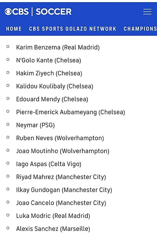 وضمت القائمة أيضا السنغالي كوليبالي نجم تشيلسي والمستهدف من الهلال، وإدوارد ميندي الذي يسعى الأهلي للتعاقد معه وكذلك رياض محرز.