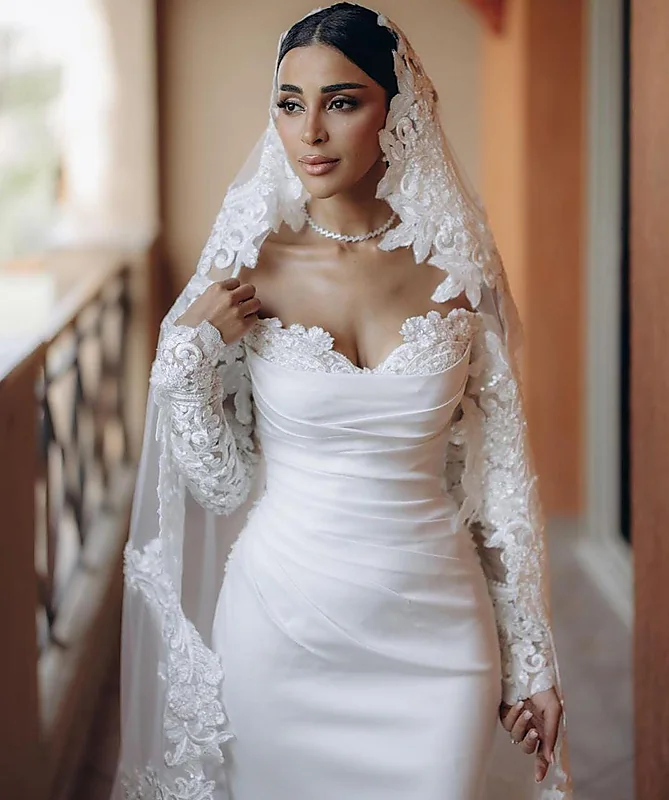 وأطلت «العنود» بفستان زفاف أبيض من توقيع المصمم حيدر حسون ، والذي تميز بقصة تعانق الجسم مع تصميم الصدر المكشوف من دون كتفين، وكمين طويلين من الدانتيل و طرحة كلاسيكية منسدلة بذيل طويل .