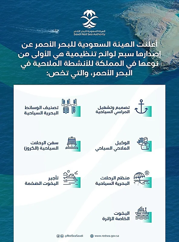 أعلنت الهيئة السعودية للبحر الأحمر، عن 7 لوائح تنظيمية للأنشطة الملاحية في البحر الأحمر، والتي تخص تصميم وتشغيل المراسي السياحية، وتصنيف الوسائط البحرية السياحية، وسفن الرحلات السياحية "الكروز".