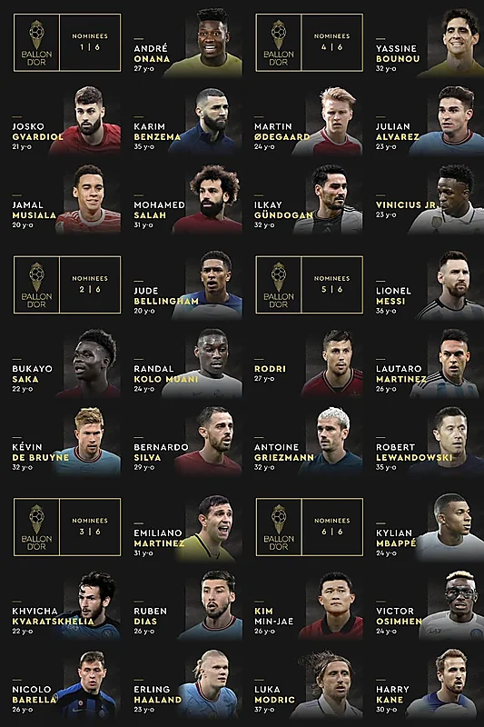 وضمت القائمة كريم بنزيما نجم الاتحاد، ومحمد صلاح نجم ليفربول، والأرجنتيني ليونيل ميسي، والمهاجم النرويجي آيرلينغ هالاند مهاجم مانشستر سيتي، ومهاجم باريس سان جيرمان الفرنسي كيليان مبابي.