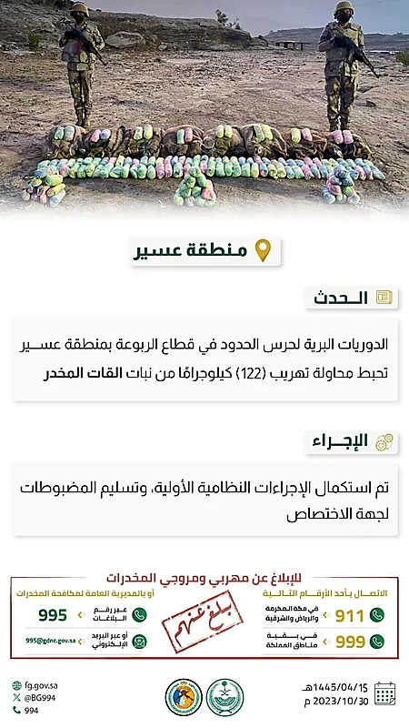 أحبطت الدوريات البرية لحرس الحدود في قطاع الربوعة بمنطقة عسير محاولة تهريب (122) كيلوجرامًا من نبات القات المخدر، وجرى استكمال الإجراءات النظامية الأولية، وتسليم المضبوطات لجهة الاختصاص.