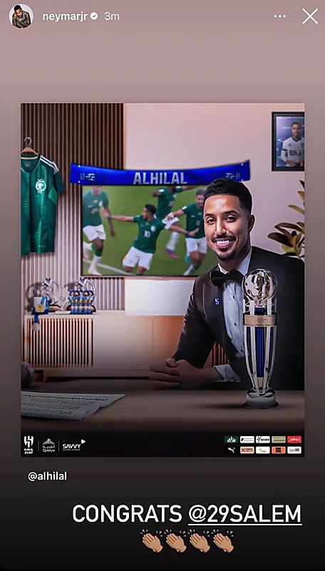 ونشر نيمار على حسابه الشخصي بتطبيق «إنستغرام» ، صورة الدوسري برفقة الجائزة ، وعلق عليها :"مبروك سالم" .