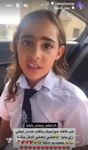 نشر الفنان المصري تامر حسني مقطع فيديو عبر حسابه الشخصي على "إنستغرام"، لإبنته الوسطى أمايا وهي تقلد أحد أدواره في فيلم عمر وسلمى.