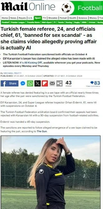 وقالت إليف لأول مرة بعد انتشار مقطع فيديو يكشف وجود علاقة جنسية برفقة مفتش حكام الدوري الممتاز أورهان إردمير البالغ من العمر 61 عاما:" أن مقطع الفيديو مفبرك وتم إنشائه عبر الذكاء الإصطناعي ونفت بشكل قاطع وجود علاقة مع المسؤول أو تصوير أي مقطع غير أخلاقي.