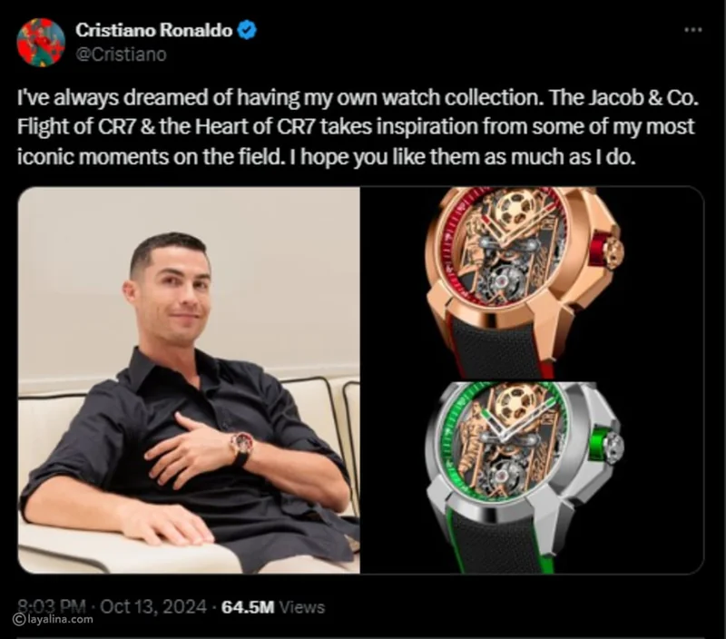 ونشر رونالدو، صورة له وهو يرتدي إحدى الساعات في يده، عبر حسابه الشخصي على منصة التواصل الاجتماعي إكس، بالإضافة إلى صور للساعتين بلونين مختلفين من دار جاكوب أند كو.