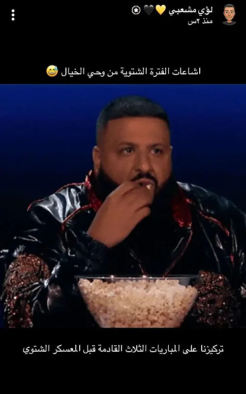 ومن جانبه، نشر مشعبي عبر حسابه الشخصي بتطبيق «سناب شات»، صورة لشخص يتناول الفشار وعلق عليها: "إشاعات الفترة الشتوية من وحي الخيال" .