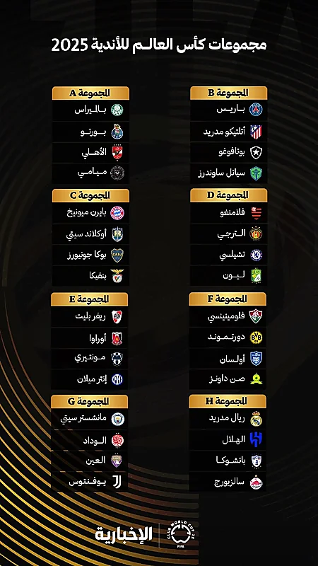 وجاءت نتائج قرعة دور مجموعات كأس العالم لأندية كرة القدم 2025؛ على النحو التالي: المجموعة «A»: بالميراس – بورتو – الأهلي – ميامي المجموعة «B»: باريس سان جيرمان – أتلتيكو مدريد – بوتافوجو – سياتل ساوندرز المجموعة «C»: بايرن ميونخ –أوكلاند سيتي – بوكا جونيورز – بنفيكا. المجموعة «D»: فلامنجو - الترجي – تشيلسي – كلوب ليون. المجموعة «E»: ريفير بليت – أوراوا – مونتيري – إنتر ميلان. المجموعة «F»: فلومينينسي – بوروسيا دورتموند – أولسان هيونداي -صن داونز. المجموعة «G»: مانشستر سيتي – الوداد – العين – يوفنتوس. المجموعة «H»: ريال مدريد – الهلال– باتشوكا – ريد بول سالزبورج.