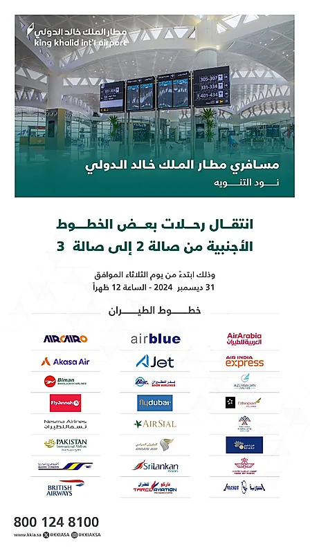 وقال المطار عبر حسابه الرسمي بمنصة «إكس» : "أعزاءنا مسافري مطار الملك خالد الدولي، نود إعلامكم أن رحلات الخطوط الأجنبية أدناه ستنقل من صالة السفر الدولية 2 إلى صالة السفر الدولية 3 يوم الثلاثاء الموافق 31 ديسمبر، 2024 ابتداءً من الساعة 12:00 ظهر" .