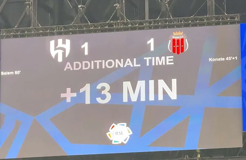 وكتب العجلان، على حسابه بموقع "إكس" :"هناك أمور غريبة تحدث أحيانًا في الملعب يوم أمس لم نشاهد لوحة الوقت بدل الضائع إلا وهي ترفع بـ 13 دقيقة ولم يرفع غير هذه اللوحة شي اخر .. فلماذا يتم وضع رقم مختلف على شاشة التلفاز ومن ثم يستبدل الرقم ؟! ".