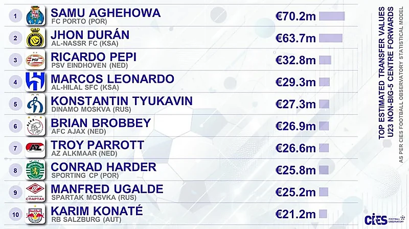 كشف تصنيف CIES Football عن قائمة أغلى المهاجمين تحت 23 عامًا من خارج الدوريات الخمس الكبرى، وشهدت القائمة تألق نجمين من دوري روشن.