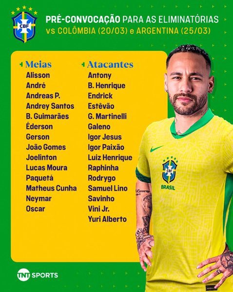 أعلن الاتحاد البرازيلي لكرة القدم، القائمة الأولية لمنتخب البرازيل، استعدادًا لفترة التوقف الدولي في شهر مارس، وشهدت القائمة تواجد ثنائي من دوري روشن.