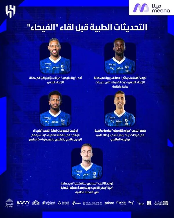 ويستعد الهلال لمواجهة الفيحاء في لقاء يسعى خلاله لتعزيز صدارته في الدوري، وسط محاولات الجهاز الطبي لاستعادة لاعبيه المصابين في أقرب وقت ممكن.
