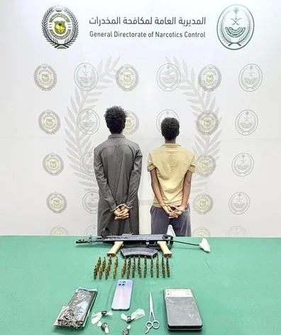كما قبضت المديرية العامة لمكافحة المخدرات على مخالفين لنظام أمن الحدود من الجنسية الإثيوبية بمنطقة جازان لترويجهما مادة الحشيش المخدر، وأوقفا واتخذت الإجراءات النظامية بحقهما، وأحيلا إلى النيابة العامة.