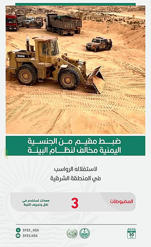 ضبطت القوات الخاصة للأمن البيئي مقيمًا مخالفًا لنظام البيئة من الجنسية اليمنية؛ لاستغلاله الرواسب في المنطقة الشرقية، وتم تطبيق الإجراءات النظامية بحقه.