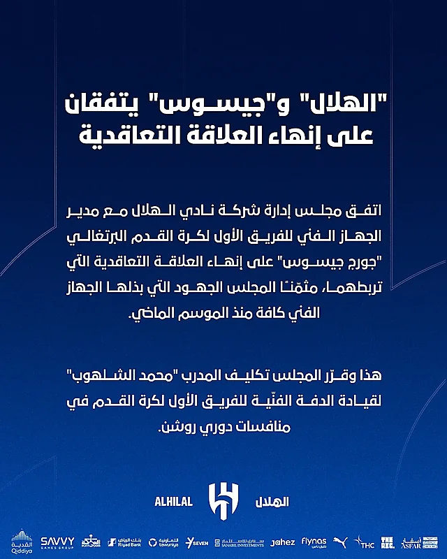 الهلال يعلن رسمياً إقالة جيسوس