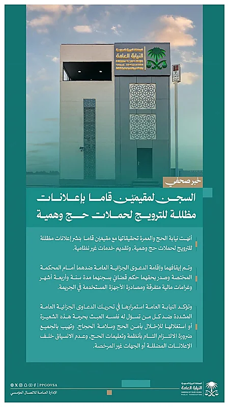 النيابة العامة: السجن لمقيمَيْن قاما بإعلانات مظللة للترويج لحملات حج وهمية