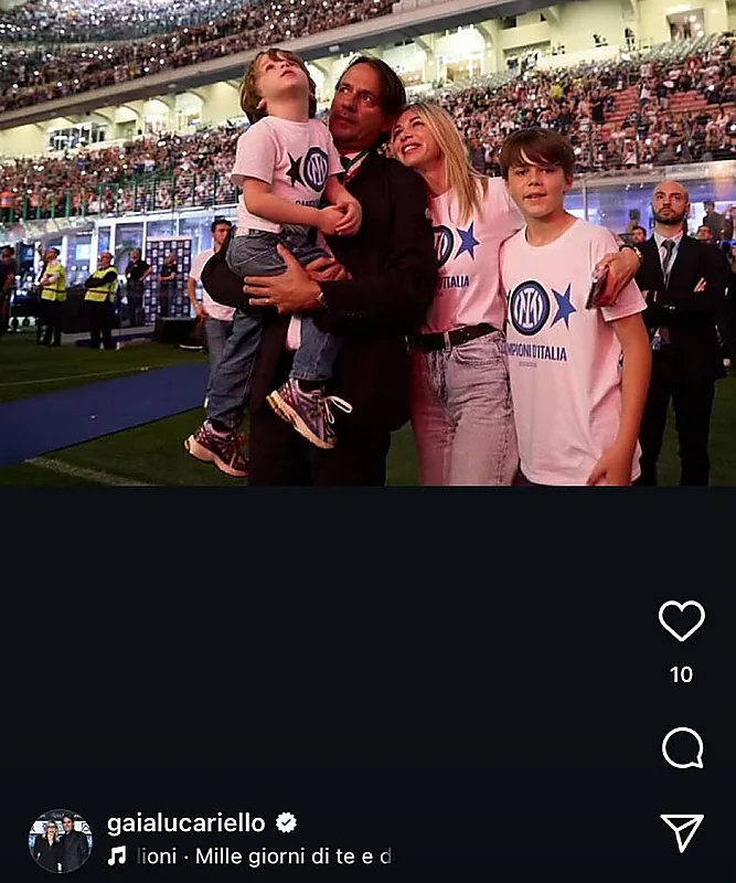 نشرت غايا لوكاريلو، زوجة المدرب الإيطالي سيموني إنزاغي، صورة مؤثرة عبر حسابها الرسمي في تطبيق إنستغرام، وثقت من خلالها لحظات الوداع من نادي إنتر ميلان، وذلك بعد إعلان رحيل زوجها عن الفريق.