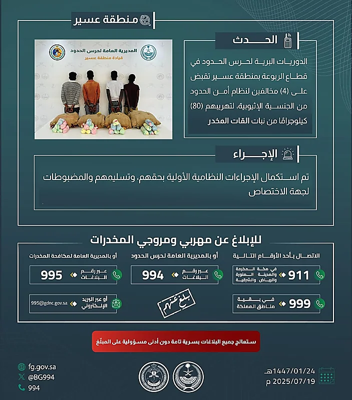 قبضت الدوريات البرية لحرس الحدود في قطاع الربوعة بمنطقة عسير على (4) مخالفين لنظام أمن الحدود من الجنسية الإثيوبية، لتهريبهم (80) كلجم من نبات القات المخدر، وجرى استكمال الإجراءات النظامية الأولية بحقهم، وتسليمهم والمضبوطات لجهة الاختصاص. وتهيب الجهات الأمنية بالإبلاغ عن كل ما يتوافر من معلومات لدى المواطنين والمقيمين عن أي نشاطات ذات صلة بتهريب أو ترويج المخدرات، وذلك من خلال الاتصال بالأرقام (911) في مناطق مكة المكرمة والمدينة المنورة والرياض والشرقية، و(999) و(994) في بقية مناطق المملكة، ورقم بلاغات المديرية العامة لمكافحة المخدرات (995)، وعبر البريد الإلكتروني (Email: [email protected])، وستعالج جميع البلاغات بسرية تامة، دون أدنى مسؤولية على المبلّغ.
