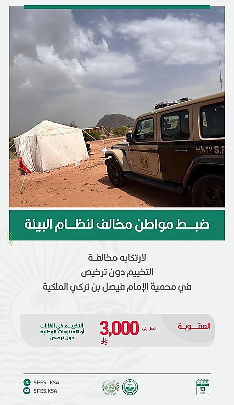ضبطت القوات الخاصة للأمن البيئي مواطنًا مخالفًا لنظام البيئة، لارتكابه مخالفة التخييم دون ترخيص في محمية الإمام فيصل بن تركي الملكية، وجرى تطبيق الإجراءات النظامية بحقه. وأوضحت القوات أن عقوبة مخالفة التخييم في الغابات أو المتنزهات الوطنية دون ترخيص غرامة تصل إلى (3,000) ريال، حاثةً على الإبلاغ عن أي حالات تمثل اعتداءً على البيئة أو الحياة الفطرية على الرقم (911) بمناطق مكة المكرمة والمدينة المنورة والرياض والشرقية، و(999) و(996) في بقية مناطق المملكة، وستعامل جميع البلاغات بسرية تامة دون أدنى مسؤولية على المبلّغ.