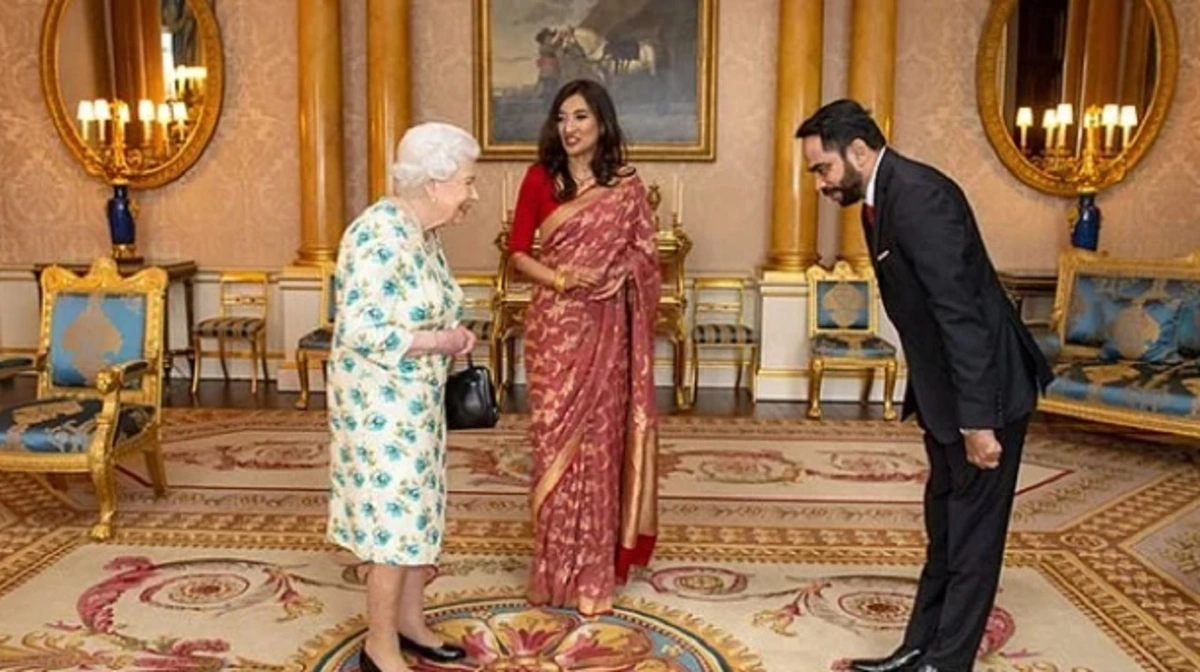 والتقطت لها صورة وهي تلتقي بالمفوضية السامية لسريلانكا ساروجا سيريسينا وزوجها الدكتور سوداث تالباهوا في قصر باكنجهام ولم تصافحهما.