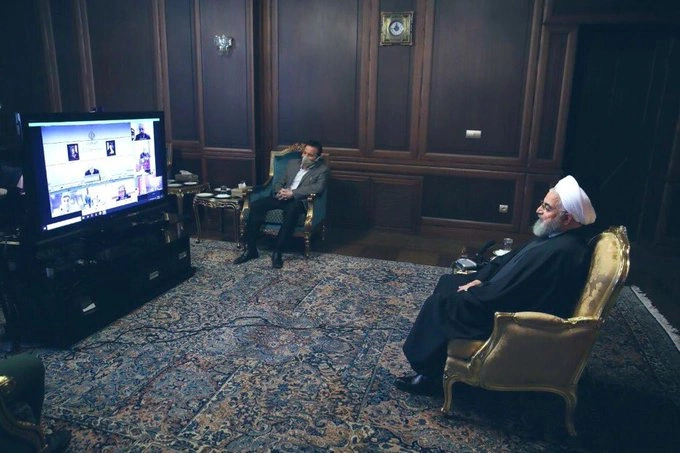 أظهرت صورة متداولة الرئيس الإيراني حسن روحانى، في عزلته الصحية بعد إصابته بفيرس " كورونا "، ومدير مكتبه يحتاط منه بـ "الكمام".