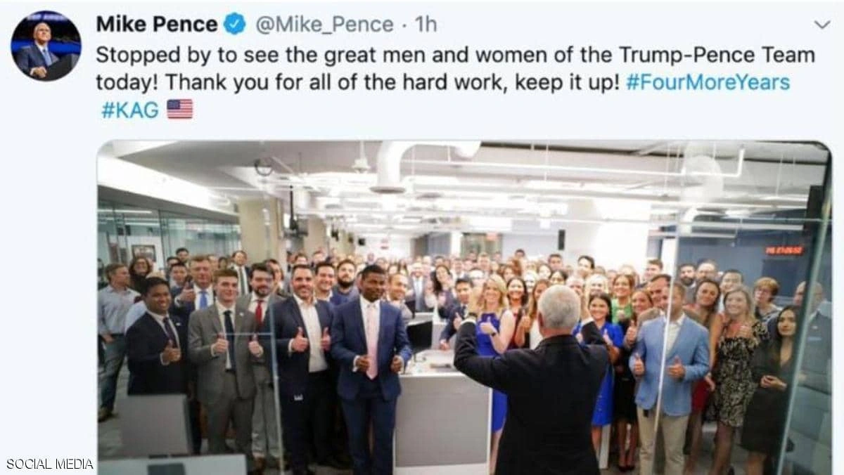 نشر نائب الرئيس الأمريكي مايك بنس، صورة مثيرة للجدل تظهر العشراء من أعضاء فريق الرئيس الانتخابي دون ارتداء الأقنعة أو مراعاة التباعد الاجتماعي.