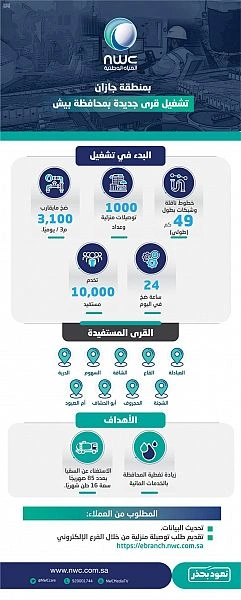 وأكد المهندس بندر جبر مدير خدمات المياه في منطقة جازان، أن قرى محافظة بيش التي شملتها الخدمة، هي: المبادلة والقاع والشاقة والسهوم والدربة والشيخة والحجرف وأبو الحشاف وأم الصيود، حيث مُدّ أكثر من 49 كيلو مترًا طوليًا من الخطوط الرئيسية والفرعية، كما نُفذت نحو 1000 توصيلة وعداد مياه، فيما سيُضخ 3100 متر مكعب يوميًا من المياه إلى أكثر من 10 آلاف مستفيد في القرى الـ 9، وستكون ساعات الضخ نحو 24 ساعة يوميًا".