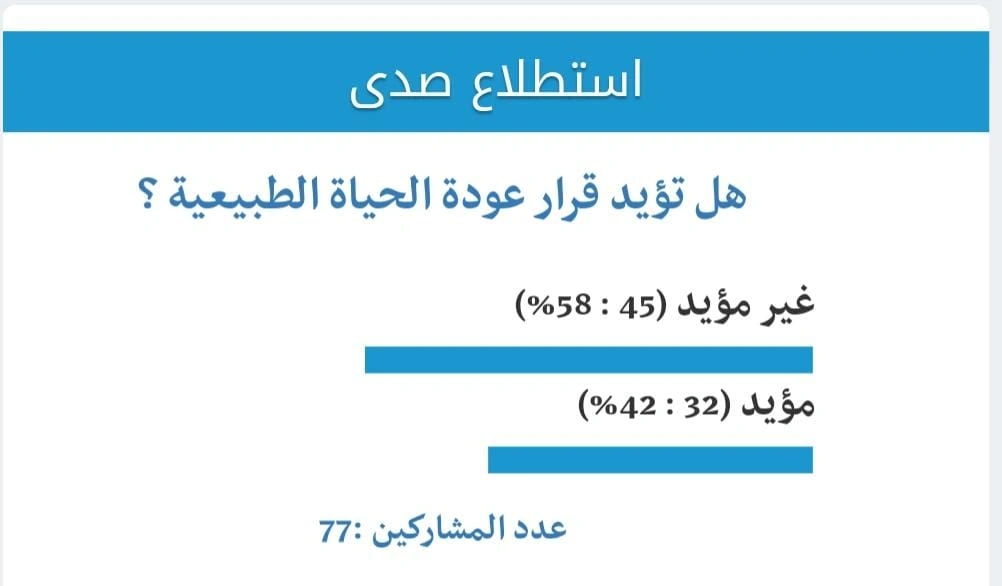 وجاء في الاستطلاع 58% غير مؤيد لقرار عودة الحياة الطبيعية في حين 42% مؤيد للقرار، وهم 32 شخص.