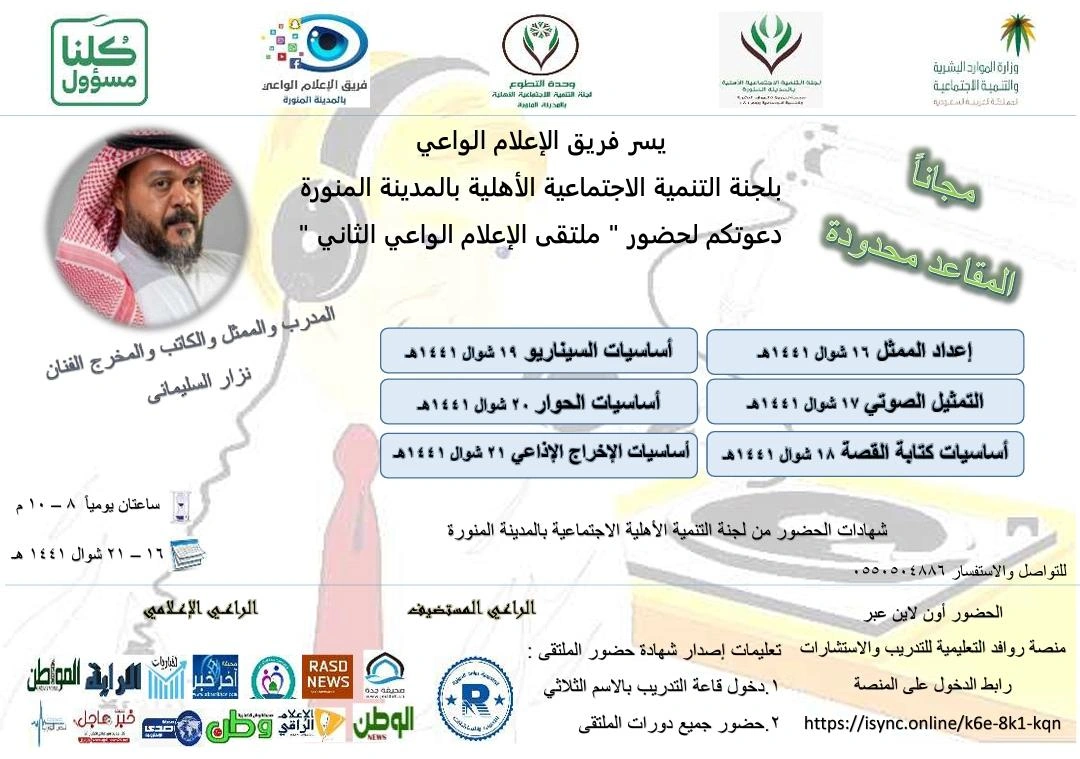 مبادرة يقدمها فريق الإعلام الواعي بلجنة التنمية الاجتماعية الأهلية بالمدينة المنورة اون لاين عبر منصة روافد التعليمية للتدريب والاستشارات.