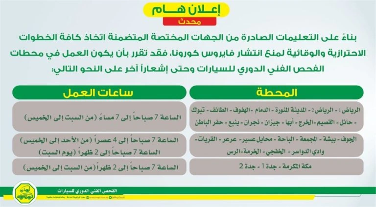 مواعيد العمل الجديدة في محطات الفحص الدوري بجدة