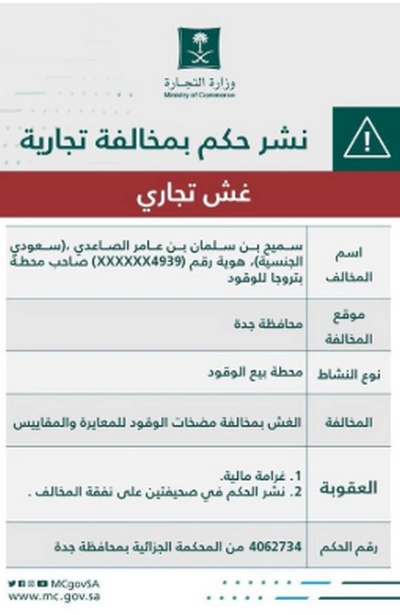 شهرت وزارة التجارة، اليوم الخميس، بصاحب محطة وقود سعودي الجنسية؛ لقيامه بالغش في بيع الوقود.